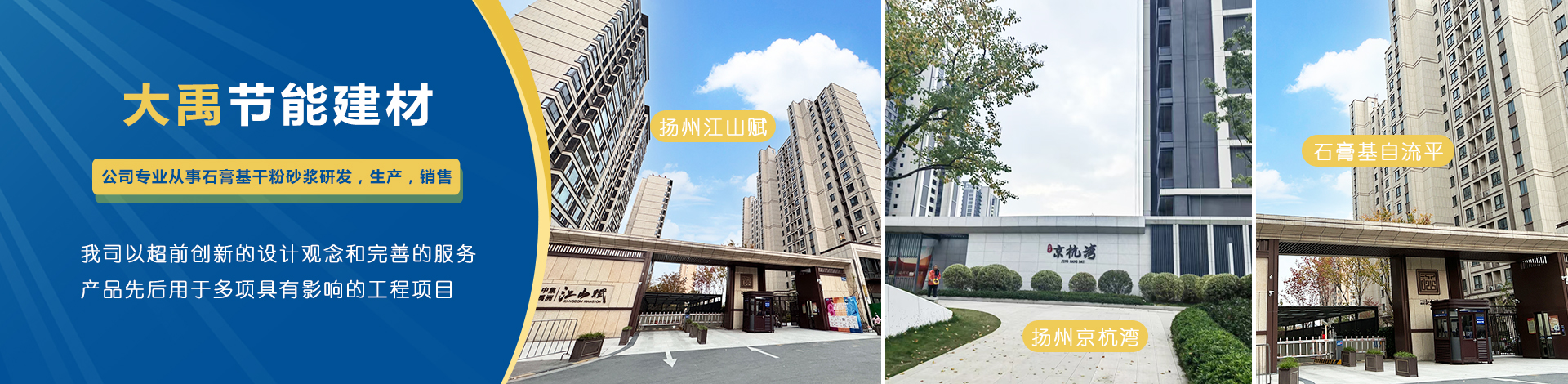 揚州市大禹節(jié)能建材科技有限公司成立于2005年9月,位于聯(lián)合國宜居城市---江蘇省揚州市,地處江都經(jīng)濟開發(fā)區(qū),與揚、鎮(zhèn)、泰三市接壤,交通十分便捷。公司是專業(yè)從事石膏基干粉砂漿研發(fā),生產(chǎn),銷售一體化的綜合性科技型企業(yè),為國家標準GB/T2862-2012《抹灰石膏》的參編單位。  公司擁有國內(nèi)一流的特種砂漿生產(chǎn)線,并配有各種先進的檢測儀器,年生產(chǎn)能力可達10萬噸。各崗位管理及技術(shù)人員齊備,對產(chǎn)品···